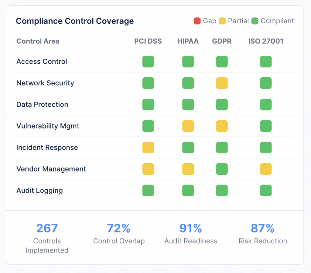 Yes, significantly. Our customers typically report a 40-60% reduction in audit preparation time and costs. This is achieved through automated evidence collection, pre-built compliance reports, and continuous compliance monitoring that prevents audit findings. By consolidating controls across multiple regulations, we also help reduce the overall cost of maintaining compliance by eliminating redundant security measures and streamlining verification processes.