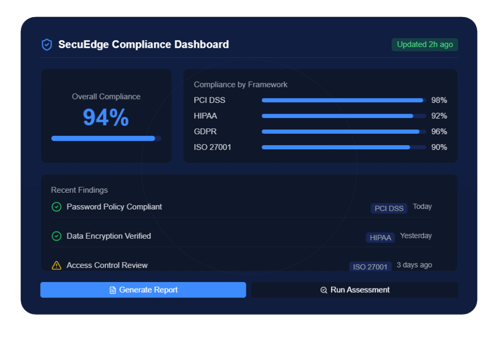 Meet and exceed regulatory requirements with SecuEdge’s comprehensive compliance solutions. Protect your data, satisfy auditors, and build trust with customers.
